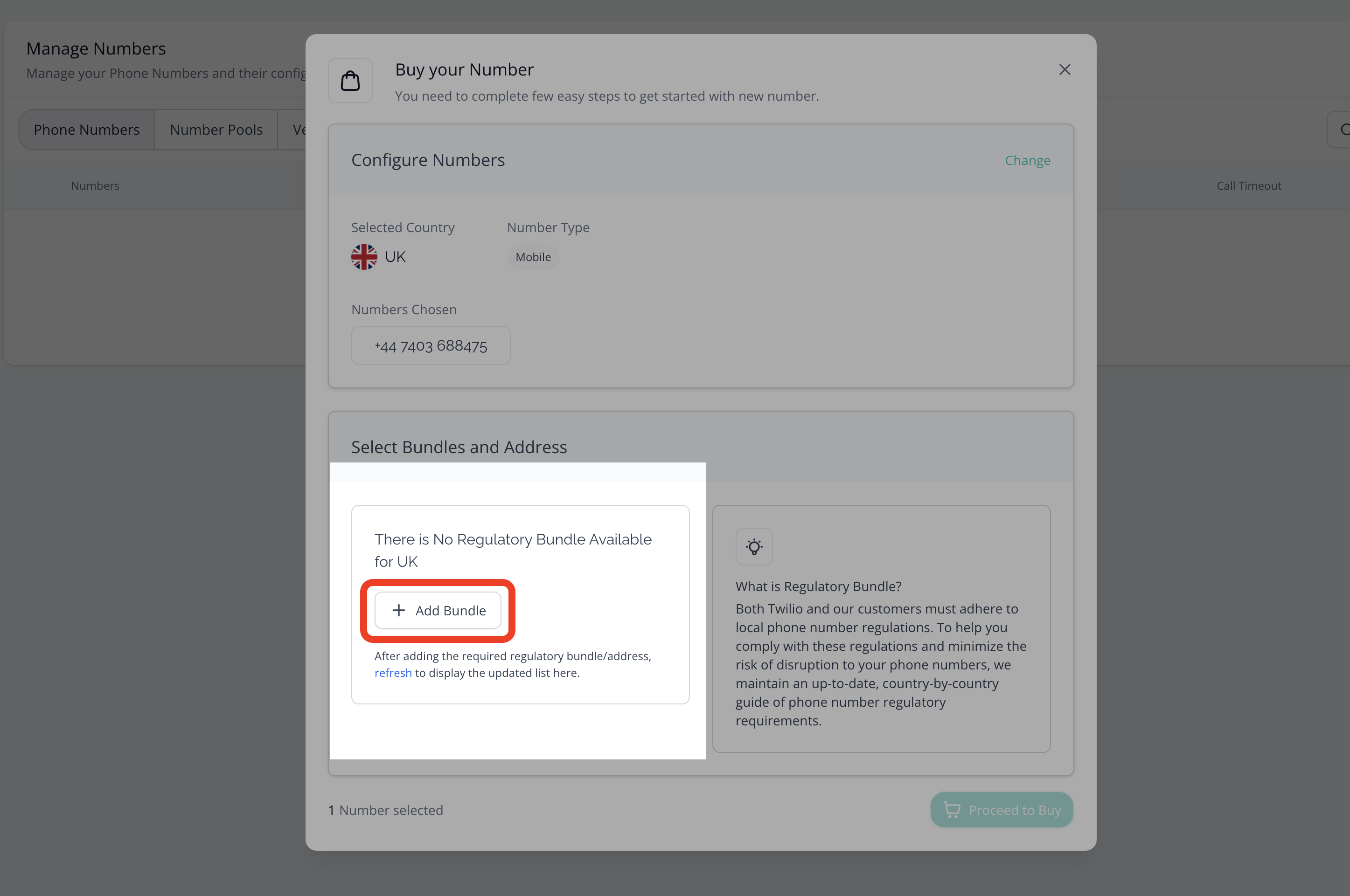 A regulatory Bundle or Address is required when purchasing phone numbers in most countries outside the USA and Canada.