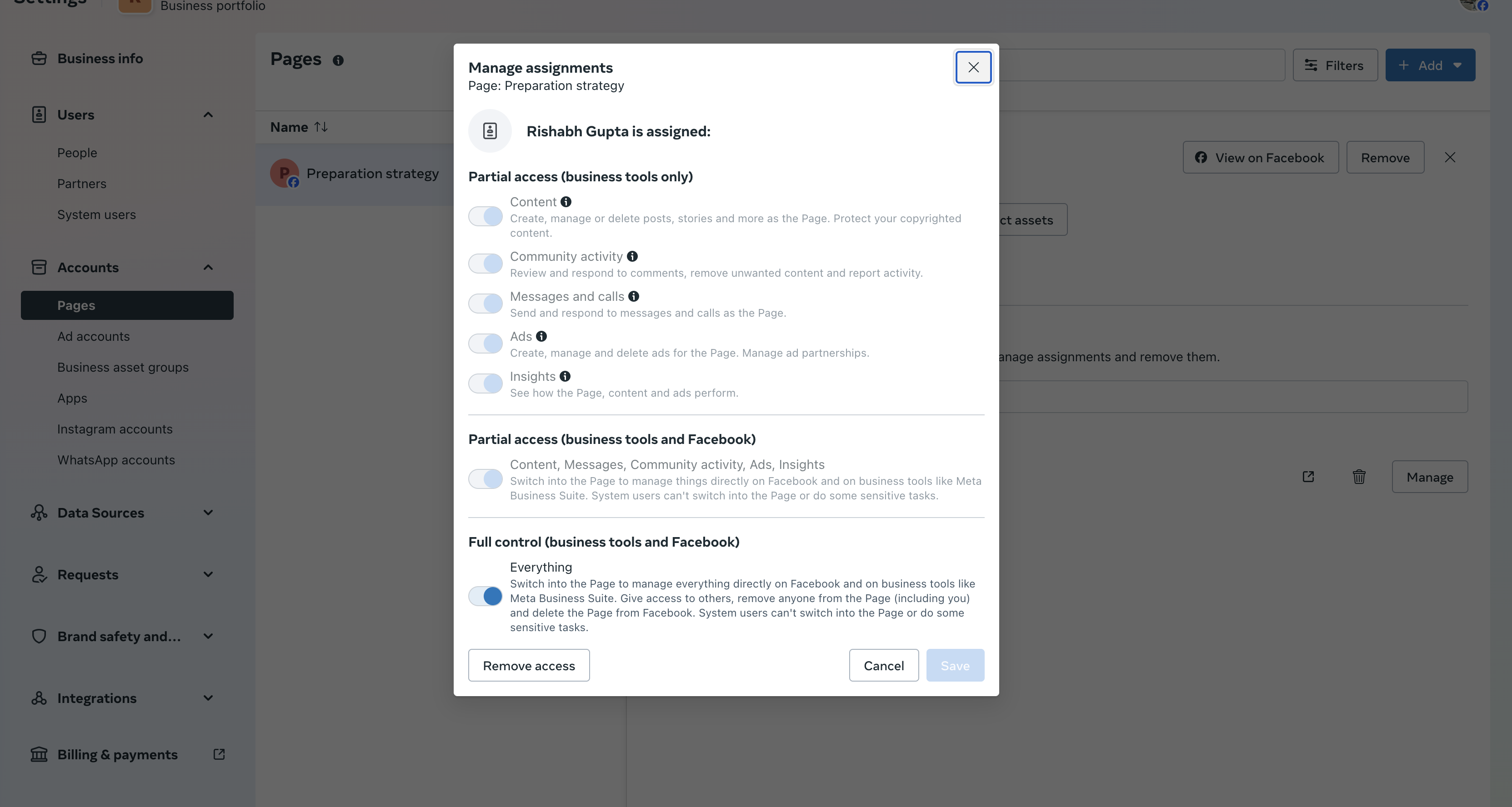 Confirm your Facebook user has full administrative access.